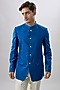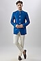 Featuring a cobalt blue bandhgala in jacquard silk base with geometric print and bead embroidery. Style it up with pants and mojaris for a festive occasion or engagement ceremony, exuding charm and elegance.
