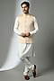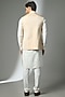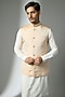 Featuring a gold and white bundi jacket in brocade silk base. Style with trousers and loafers for a festive occasion, pooja ceremony or cultural events, exuding traditional charm and elegance.