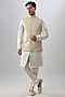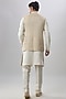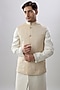 Featuring a gold and white bundi jacket in brocade silk base. Style it up with a kurta set and mojaris for a festive occasion or pooja ceremony, exuding charm and elegance.