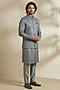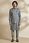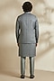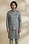 Featuring a grey bundi jacket in silk satin linen base with print. Style it with a kurta set and pair of mojaris for a reception, sangeet, wedding or engagement ceremony.