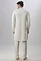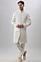 Featuring a white sherwani in herringbone matka silk base with embroidery and print. Style it with pants and mojaris for a wedding, sangeet or engagement ceremony, exuding charm and elegance.