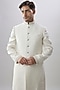 Featuring a white sherwani in jacquard brocade silk base with zardosi embroidery and geometric print. Style it with pants and mojaris for a wedding, sangeet or engagement ceremony, exuding charm and elegance.