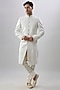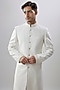 Featuring a white sherwani in jacquard silk base with threadwork, zardosi embroidery and geometric print. Style it with pants and mojaris for a wedding, sangeet or engagement ceremony, exuding charm and elegance.