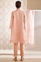 Featuring a peach A-line kurta in silk organza base with bell sleeves, lace, hand beaded and ikat motif detailing. It is paired with matching viscose silk narrow pants, a silk organza dupatta and a slip.