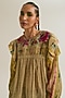 Featuring an ecru top in chanderi silk base with patchwork machine embroidery. Balance the structure with tailored pants and sleek heels for effortless elegance.