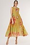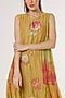 Featuring a mustard flared dress in chanderi silk base with patchwork, sequins and applique embroidery, including tie-dye print.