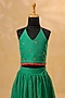 Featuring a green halter top for girls in kota doria base with lace embroidery. It is paired with a skirt. Style it with cute hair accessories and sandals for festive occasions or pooja ceremony.