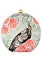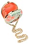 Featuring a mint and pink round box clutch in polyester satin base with peacock and floral digital print and faux leather trim detailing. It has a textured oval clasp and a golden long chain handle.