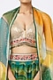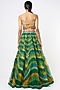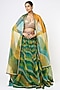 Featuring a forest green and citrus yellow lehenga in organza base with wave print and mukaish embroidery. It is paired with a contrasting sequinned blouse and a dupatta.