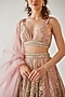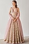 Featuring a gold and blush pink lehenga in tulle base with sequins embroidery. It is paired with a matching pleated blouse and an organza foil printed dupatta.