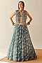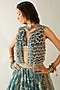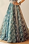 Featuring a lake blue lehenga in organza base with hand and machine embroidery. It is paired with a matching draped blouse and a pearl scalloped gillet.