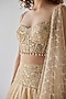 Featuring a nude and gold lehenga in organza base with foil print. It is paired with a matching embroidered tulle corset and a draped dupatta.