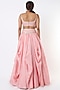 Featuring a pink draped lehenga in chinon silk base. It is paired with a matching chanderi brocade blouse having embroidery and a tulle cape.