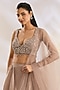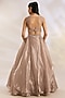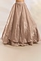 Featuring a champagne lehenga in organza and net base. It is paired with a choli having sequins, cutdana, zircons, beads and stones embellishment, including a dupatta. Accentuate it with crystal drop earrings and a sleek metallic clutch for a refined, cohesive look, ideal for wedding receptions, sangeet nights or glamorous evening celebrations.
