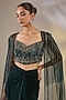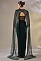 Featuring a green blouse in net and lycra base with sequins, zircon, pearl, beads and cutdana embellishments. It is paired with a draped skirt and a cape. Style it with zircon earrings, a clutch bag and nude heels. Perfect for festive celebrations like Diwali parties, Bhai Dooj, mehendi functions, receptions, or cocktail evenings.
