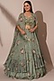 Featuring a green lehenga in organza base with print. It is paired with a matching embroidered crop top and a printed cape.