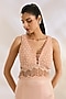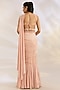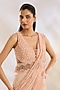 Featuring a peach lehenga saree in net and lycra base. It is paired with a blouse having sequins, cutdana, pearls, beads, crystals and french-cut embellishment, including a dupatta. Accentuate it with delicate crystal drop earrings, strappy heels and a sleek bracelet to complement its soft glamour, ideal for engagement parties, cocktail evenings or festive celebrations.