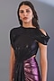 Featuring a dual colored black and purple draped gown in stretch knit foil base with drooping sleeves.