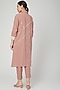 Featuring a peach high-low shirt in cotton linen base with embroidered pleats. It is paired with matching pants.
