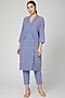 Featuring a sky blue shirt dress in cotton linen base with buttons. It is paired with matching pants having elasticated back.