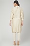 Featuring a white dress in cotton linen base with high neck and gathered elastic. It is paired with a matching pants in zari woven linen base having elasticated back.