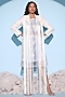 Featuring a white jacket in pure linen silk and silk organza base with fringe detail. It is paired with a contrasting blue and white hand spun hand woven cotton dress.