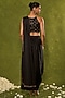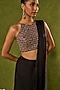 Chamee and Palak features a black dhoti saree in soft silk base with golden beads edging detail. It is paired with a velvet halter-neck blouse having sequins, zardosi, stone and motif embellishments. Style this designer set with kundan polki or meenakari jewellery and block heels for a wedding, sangeet or engagement ceremony.