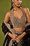 Chamee and Palak features a black lehenga in woven tissue jamawar base with zari embroidery. It is paired with a dupion silk halter-neck blouse having zari, glass beads, zardosi and sequins embroidery, including an embellished organza dupatta. Accentuate it with kundan polki jewellery, a floral hairdo and block heels for a wedding, sangeet or engagement ceremony.