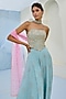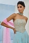 Featuring blue flared pants in raw silk, net and crepe base with embellishment. It is paired with floral glass beads embroidered corset top and a pink tulle dupatta. Accentuate it with dangler earrings and block heels for festive occasions.