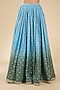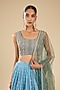 Featuring a blue and green ombre lehenga in jamawar, raw silk and net base. It is paired with a blouse having glass beads and sequins embroidery, including a tulle dupatta. Accentuate it with statement chandelier earrings and embellished heels for a stylish ensemble, ideal for weddings, sangeet celebrations or festive occasions.