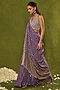 Chamee and Palak features a dusty purple halter-neck blouse in raw silk and georgette base with glass beads and pearl embroidery. It is paired with sharara pants and a pre-draped dupatta. Accentuate it with polki stud earrings, and kolhapuri block heels for a wedding, sangeet or engagement ceremony.