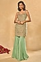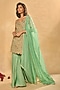 Chamee and Palak features a green kurta in velvet base with zari, sequins and glass beads embellishments. It is paired with tissue jamawar sharara pants and a sheer organza dupatta. Accentuate it with polki stud earrings, and kolhapuri block heels for a wedding, mehendi, sangeet or engagement ceremony.