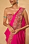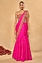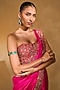 Chamee and Palak features a hot pink pre-draped saree in soft silk base with applique border detail. It is paired with a red raw silk corset having resham, zari, pearl, glass beads, sequins and zardosi embroidery. Style this designer set with kundan polki or meenakari jewellery and block heels for a wedding, sangeet or engagement ceremony.