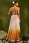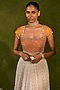 Chamee and Palak features an ivory and saffron ruched lehenga in georgette base. It is paired with a raw silk square-neck blouse having cap sleeves, pearl and sequins embroidery, including a pink organza dupatta. Accentuate it with kundan polki jewellery, a floral hairdo and block heels for a wedding, sangeet or engagement ceremony.