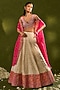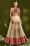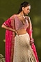 Chamee and Palak features an ivory lehenga in tissue jamawar base with applique and zari heming detailing. It is paired with a dupion silk blouse having resham, sequins, and zardosi embellishments, including a pink organza dupatta having an applique border. Accentuate it with kundan polki jewellery, a floral hairdo and block heels for a wedding, sangeet or engagement ceremony.