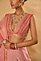 Chamee and Palak features a mauve pink and red lehenga in tissue jamawar base with pita and zari embroidery. It is paired with a dupion silk blouse having a plunging neckline and motif embroidery, including a pink organza embellished dupatta. Accentuate it with kundan polki jewellery, a floral hairdo and block heels for a wedding, sangeet or engagement ceremony.