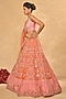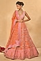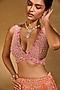 Chamee and Palak features an orange lehenga in organza base with zari, resham, pearl and glass beads embroidery. It is paired with a scalloped V-neck blouse and an orange net dupatta having applique border. Accentuate it with kundan polki jewellery, a floral hairdo and block heels for a wedding, sangeet or engagement ceremony.