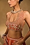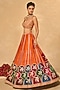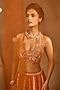 Chamee and Palak features an orange lehenga in raw silk base with glass beads and palm applique embroidery. It is paired with a velvet embroidered halter blouse having a high-neckline and a n orange tulle dupatta. Accentuate it with kundan polki jewellery, a floral hairdo and block heels for a wedding, sangeet or engagement ceremony.