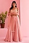 Featuring a peach-pink lehenga in raw silk, jamawar and net base with woven boota detail. It is paired with a halter neck blouse having zari, sequins and zardosi embroidery, including a tulle embellished dupatta. Accentuate it with dangler earrings and block heels for weddings or sangeet ceremonies.