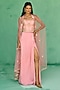 Featuring a pink corset top in raw silk, net and georgette base with thread, glass beads and zardosi embroidery. It is paired with an embellished draped skirt and a tulle cape. Accentuate it with dangler earrings and heels for evening soirees.