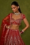 Chamee and Palak features a red lehenga in raw silk base with sequins, zardosi, thread and glass beads embroidery. It is paired with a blouse having a sweetheart neckline and cap sleeves, including a tulle dupatta having badla embellishments. Accentuate it with kundan polki jewellery, a floral hairdo and block heels for a wedding, sangeet or engagement ceremony.