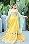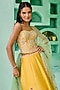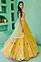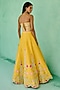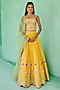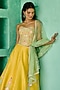 Featuring a yellow lehenga in dupion silk and net base with embroidery. It is paired with a corset blouse having resham and faux metallic leather embroidery, including a green tulle embellished dupatta. Accentuate it with dangler earrings and block heels for weddings or haldi ceremonies.