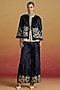 Featuring an indigo flared pants in silk velvet base with applique and beadwork. Accentuate it with top, jacket, statement earrings and elegant heels for a stylish ensemble, ideal for evening soirees.