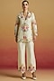 Featuring an ivory flared jacket in chanderi base with floral thread and bead work. Accentuate it with pants, statement earrings and elegant heels for a stylish ensemble, ideal for evening soirees.