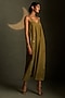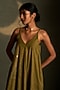 Featuring an olive dusk ankle-length dress in mul chanderi base and voil base with star motifs and glass details, including slender adjustable shoulder straps. Accentuate it with dangler earrings and heels for casual look.