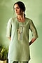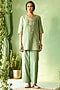 Featuring a tea green kurta in chanderi and voile base with palm tree motif embroidery. It is paired with pants. Accentuate it with statement earrings and heels for an evening or festive look.