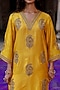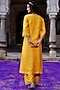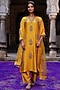 Featuring a mustard kurta in raw silk base with dori and handwork. It is paired with pants and an organza dupatta having lurex patch and kiran detailing. Style this designer set with wedges, gold jhumkas and a sleek braid for a chic ethnic look. Ideal for festive gatherings or haldi ceremonies.