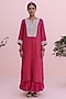 Featuring a rani pink kurta in tissue chanderi base with hand and machine embroidery. It is paired with a mul cotton crushed skirt having thread work and an organza dupatta. Accentuate it with statement jewellery and block heels for festive occasions, weddings or haldi ceremony.