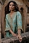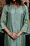 Featuring a sage green kurta in pure raw silk base with dori work. It is paired with pants and an organza dupatta having lurex patchwork and kiran detailing. Style this designer set with wedges, gold jhumkas and a sleek braid for a chic ethnic look. Ideal for festive gatherings or mehendi ceremonies.