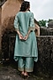 Featuring a sage green kurta in raw silk base with dori work. It is paired with pants and an organza dupatta having lurex and kiran detailing. Style this designer set with wedges, gold jhumkas and a sleek braid for a chic ethnic look. Ideal for festive gatherings or mehendi ceremonies.